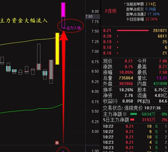 DRAWTEXT(REF(趋势强度,1)=2 AND 趋势强度=4,L,'←主力入场'),COLORMAGENTA;