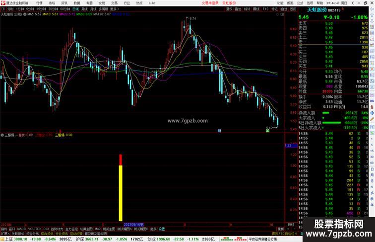 三警惕:CZS12 AND CZS3 AND (GHCZS6 OR REF(GHCZS6,1)) AND SANJ AND C>GHCZS1 AND GHCZS1>GHCZS4 AND GHCZS3>GHCZS4 AND EXIST(GHCZS1<GHCZS3,5) AND GHCZS7>2,COLORYELLOW,NODRAW;