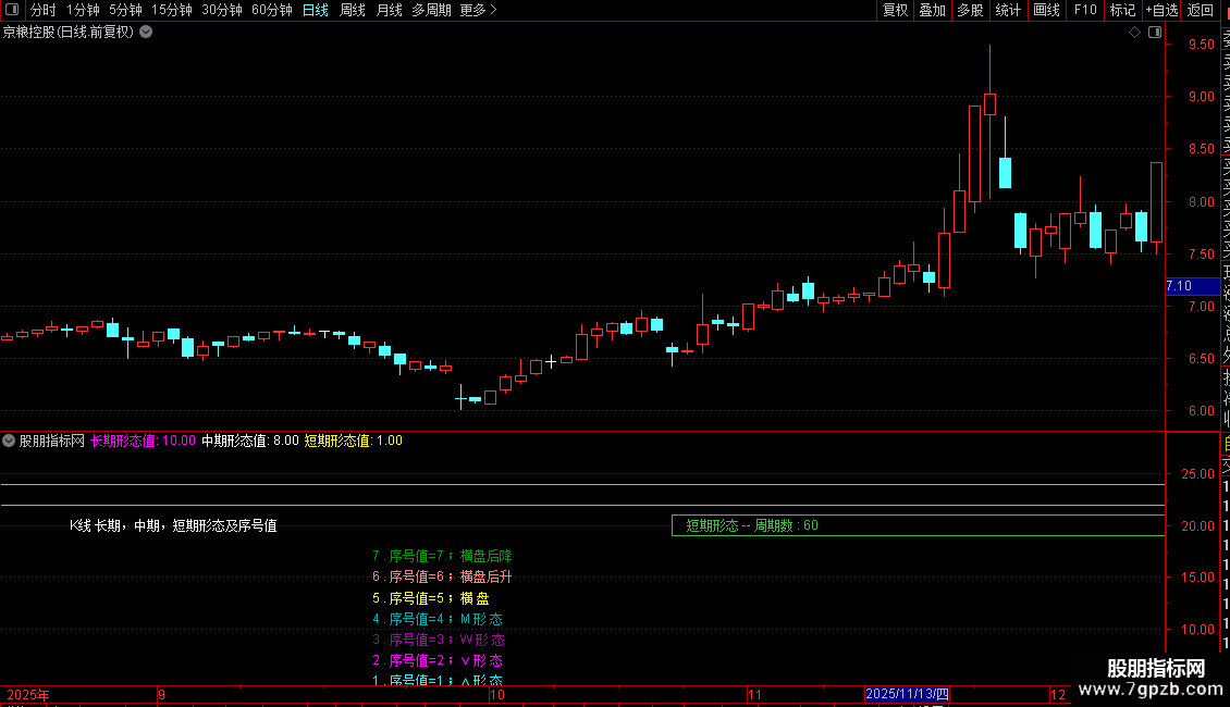 DRAWTEXT(CURRBARSCOUNT=12 AND 短期形态值=2,20,' 2. ∨ 形 态 '),COLORFF00FF;