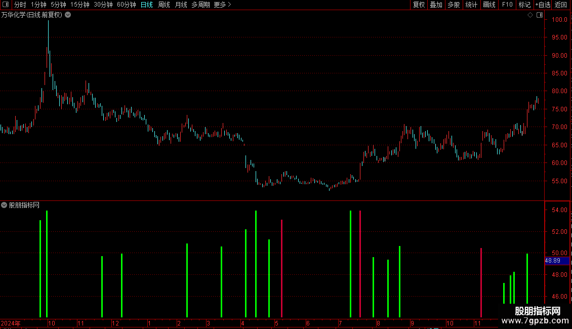 STICKLINE(C/REF(C,1)<0.901,VZ,(0-HLMN3)*HLMN2/HLMN4+HLMN1,2,0),COLORGREEN;