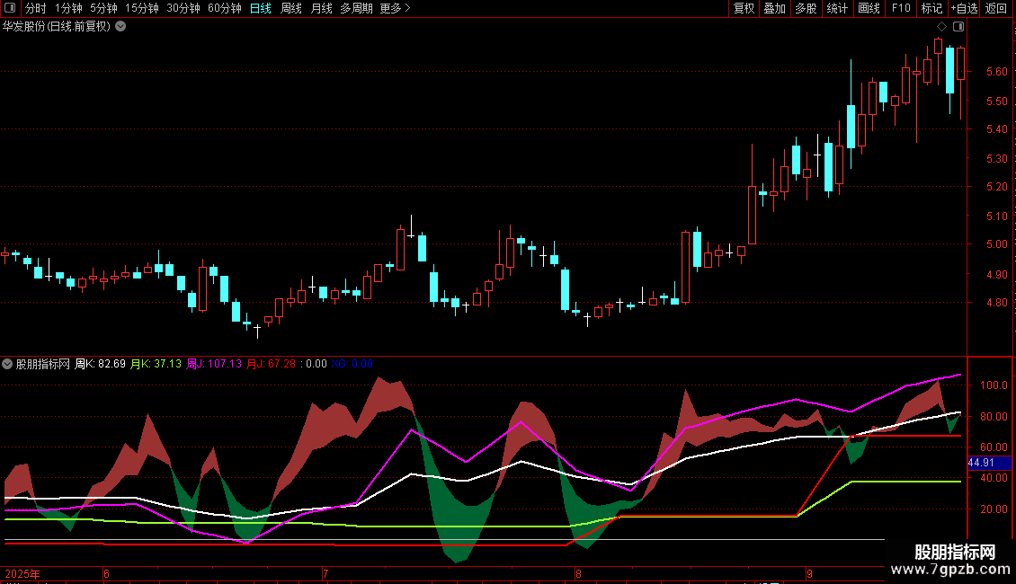 周K:MA("KDJ.K#WEEK"(N,M1,M2) ,5),LINETHICK2,COLORWHITE;