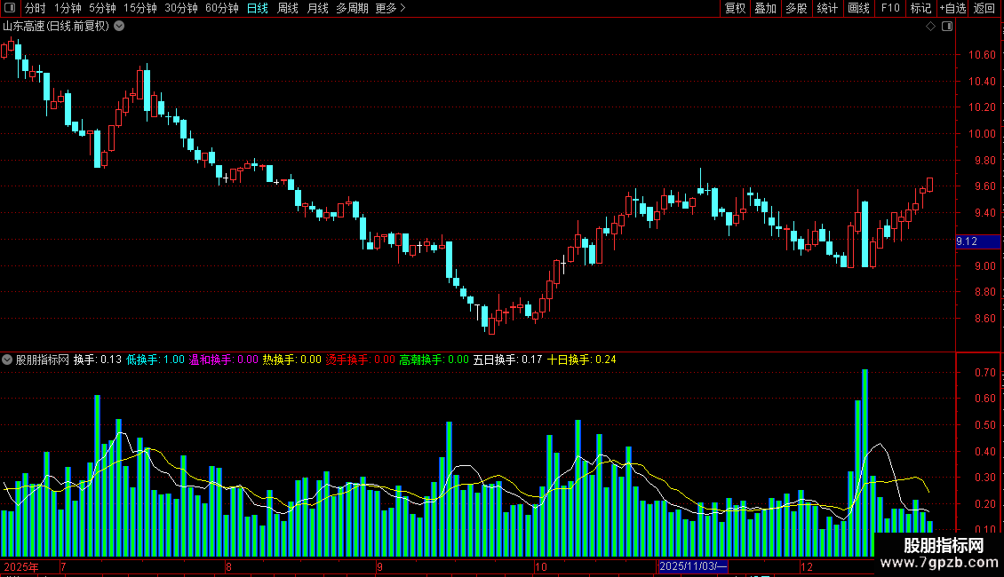 说明:低换手当换手率小于2%时,成交量柱用浅绿色显示