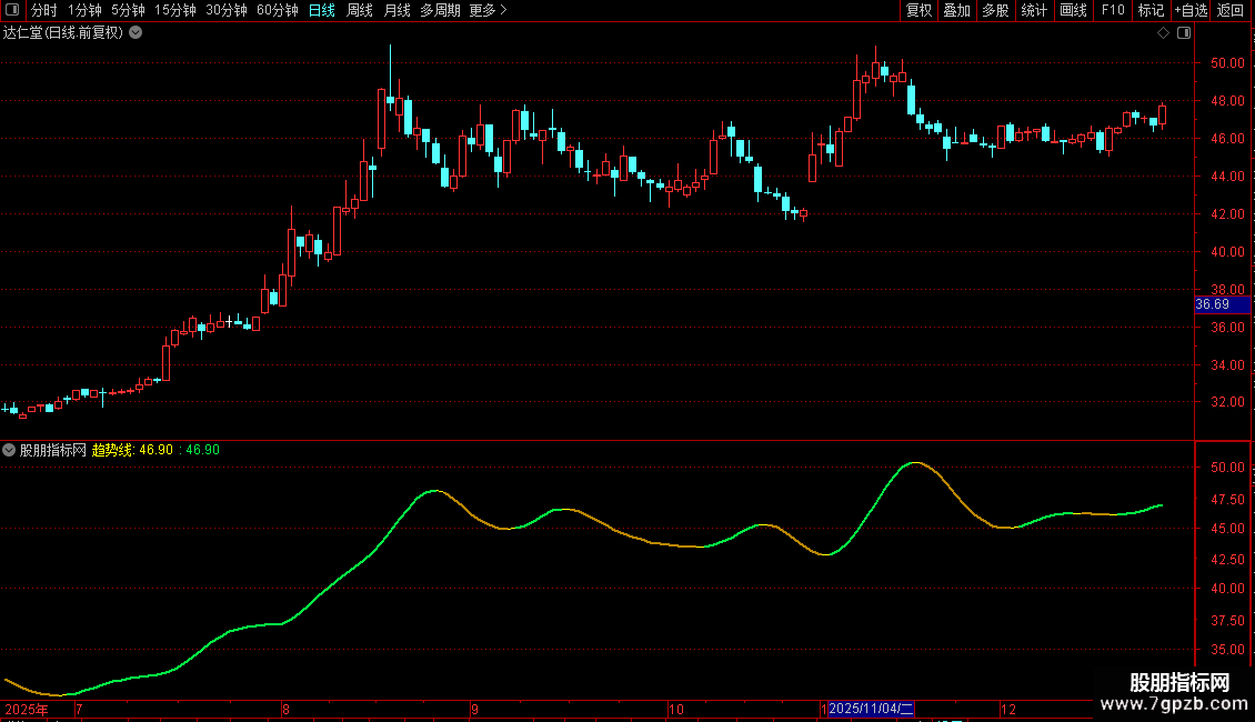 IF(趋势线>REF(趋势线,1),趋势线,DRAWNULL),COLOR44EE00,LINETHICK2;