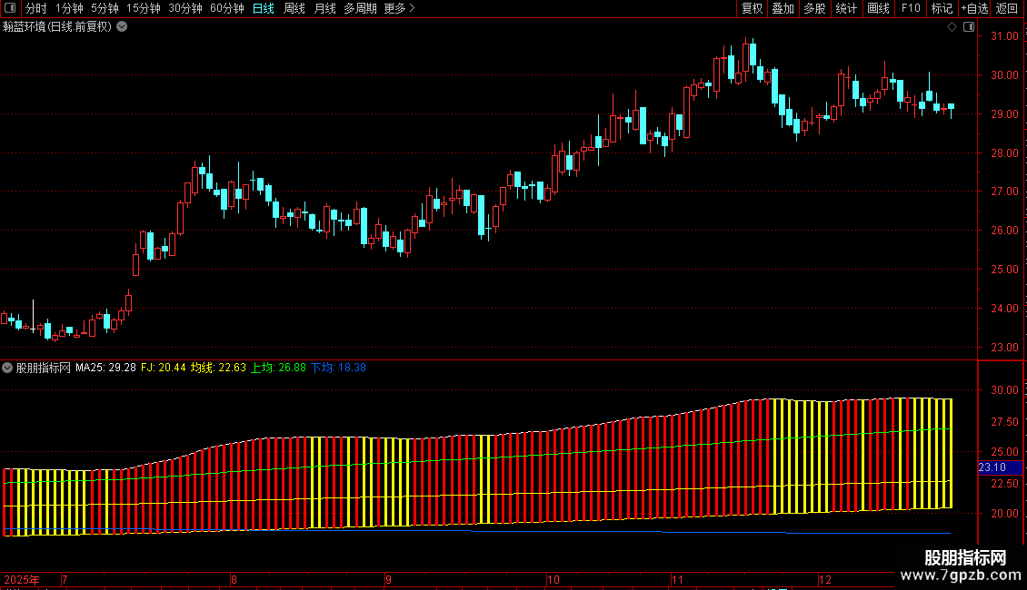 STICKLINE((MA25 <FJ)AND MA25>REF(MA25,1),MA25,FJ,1,0),COLORCYAN;