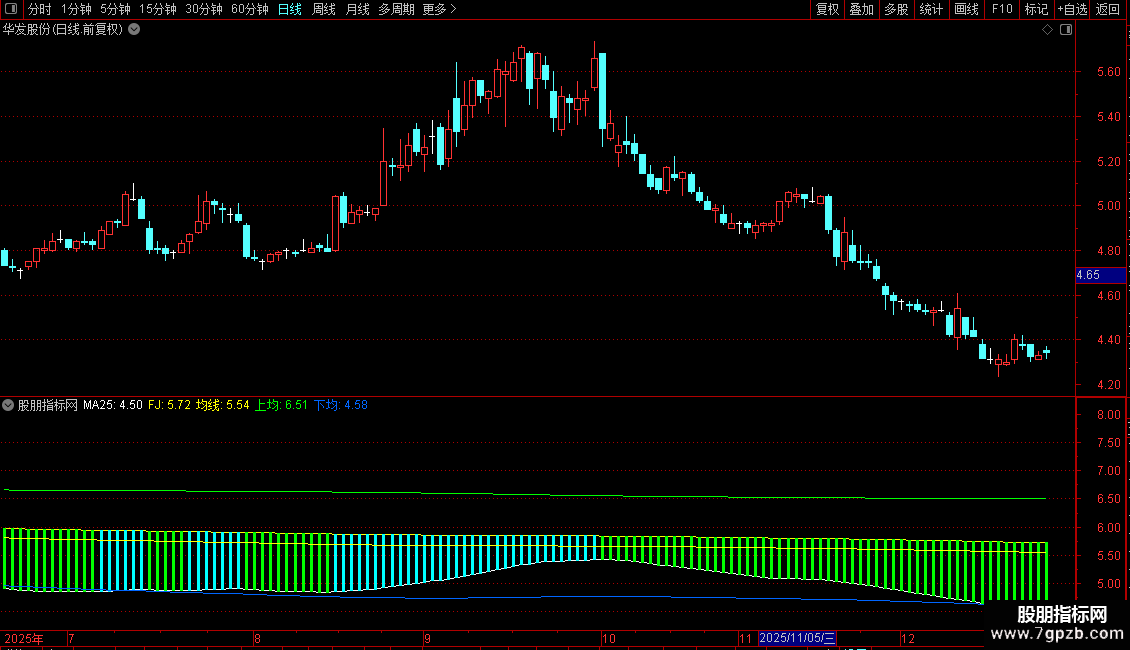 STICKLINE((MA25 >FJ)AND FJ<REF(FJ,1),MA25,FJ,1,0),COLORCYAN;
