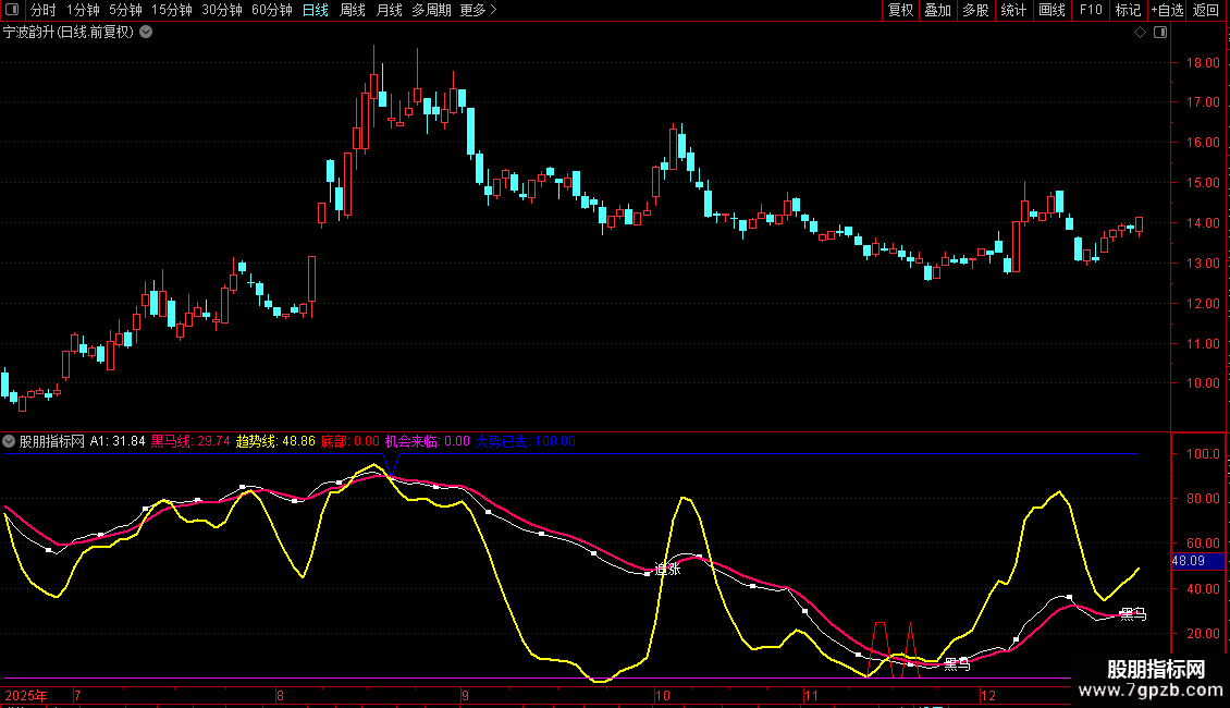 大势已去:IF(CROSS(黑马线,A1)AND 黑马线>70 AND 趋势线>80,90,100),COLORFF0000;