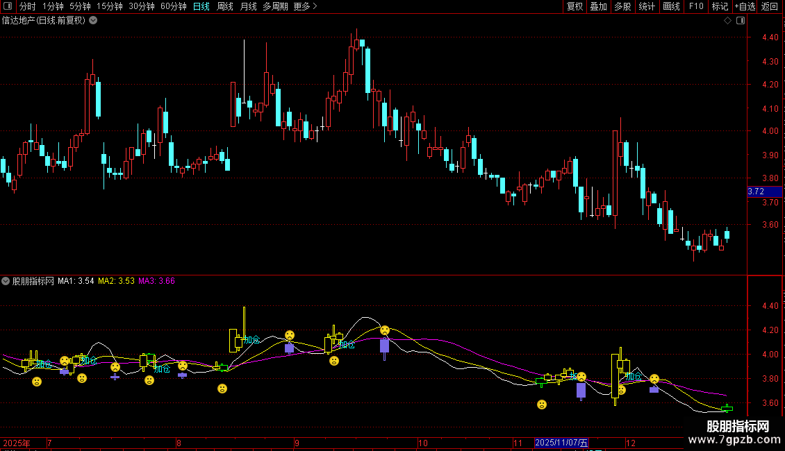 DRAWTEXT(COUNT(CLOSE>MA3,3)=3 AND REF(CLOSE,3)<REF( REF(MA3,3),1),LOW,'加仓'),COLORF0F000;