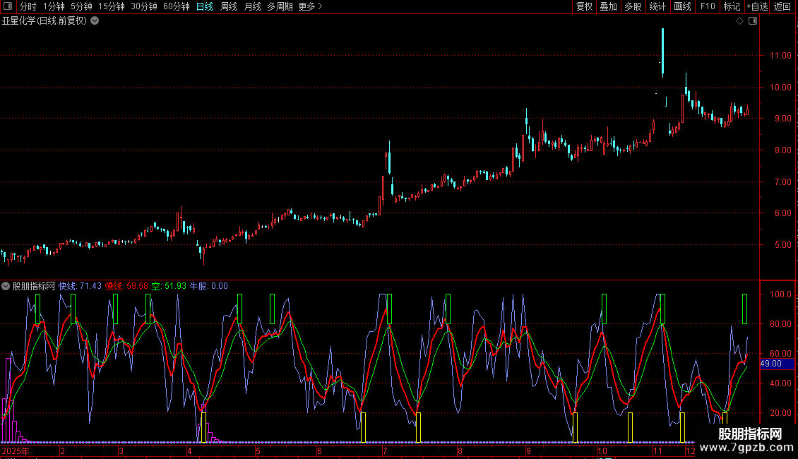 牛股:IF(BARSLAST(CROSS(慢线,空))<P AND BARSLAST(CROSS(空,慢线))<P AND CROSS(慢线,空) AND 慢线<20,90,0),STICK,COLORFF937F;