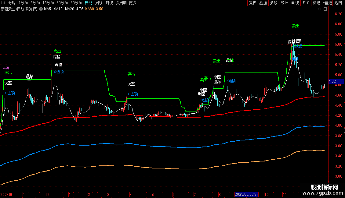 卖出提示包括输出的以下文字信号:调整、卖、卖出、逃、逃顶等。同样是根据股价运行情况决定仓位