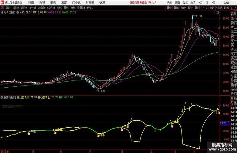 PGJL1:=REF(CLOSE,1)*1.1-CLOSE< 0.01 AND HIGH=CLOSE;STICKLINE(PGJL1,CLOSE,OPEN,1,0),COLORYELLOW;PGJL2:=5;PGJL3:=3;PGJL4:=(EMA(CLOSE,5)*7+EMA(CLOSE,10)*3)/10;PGJL5:=IF(YEAR>=2025,0,1);PGJL6:=EMA(EMA(LOW,21)+6.8*STD(LOW,2),55);PGJL7:=EMA(CLOSE/PGJL6*(1.88*CLOSE+LOW+OPEN)/2.75,3);PGJL8:=(PGJL7-PGJL6)/PGJL6/2;PGJL9:=EMA(PGJL7-PGJL8*PGJL7,5)*PGJL5;PGJL10:=EMA(CLOSE,300)-3*STD(CLOSE,300);启动参考下:IF(PGJL4>PGJL9,PGJL4,PGJL9)*PGJL5,COLORYELLOW,LINETHICK2;TY:=H;{,公式源码 PGJL4 AND PGJL9< CLOSE*0.15,EMA(CLOSE,300)-3*STD(CLOSE,300),PGJL9),COLORYELLOW,LINETHICK2;IF(PGJL9>PGJL4,启动参考上,DRAWNULL),COLORGREEN,LINETHICK2;开口XG:BARSLASTCOUNT(启动参考下!=启动参考上)=1,NODRAW;DRAWICON(开口XG,MIN(启动参考上,启动参考下)*0.96,11);DRAWTEXT(开口XG,LOW,71),COLORYELLOW;