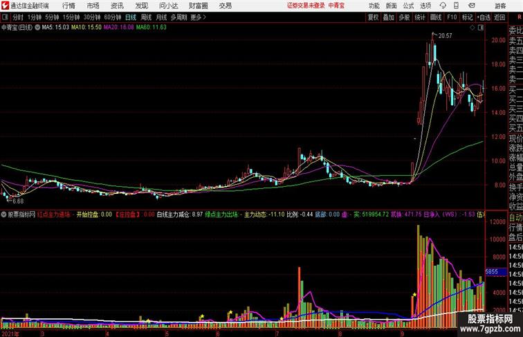 绿点主力出场:IF(个股资金<=0 AND 主力资金<=0 AND 大资金<=0,-10,DRAWNULL),COLORGREEN,CIRCLEDOT,LINETHICK1;