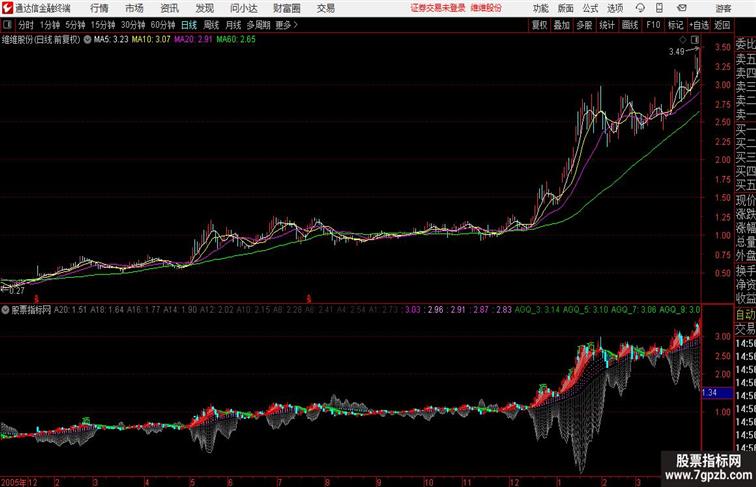 {多空因子趋势跟踪}DIF:=EMA(CLOSE,12)-EMA(CLOSE,26);DEA:=EMA(DIF,9);MACD:=(DIF-DEA)*2;M5F:=MA(C,4);M10F:=MA(C,8),COLORRED,LINETHICK2;M20F:=MA(C,20);M30F:=MA(C,30);M60F:=MA(C,60),COLORBLUE,LINETHICK2;D3:=MIN(MIN(M5F,M10F),M20F)>M60F;LLM:=LLV(MACD*100,200);HHM:=HHV(MACD*100,200);TJA:=C>REF(C,1)*1.05;T:=BARSLAST(C>REF(C,1)*1.095 AND C=H);T2L:=BARSLAST(C< REF(C,1)*1.095 AND C>REF(C,1)*1.08);T3L:=BARSLAST(C< REF(C,1)*1.08 AND C>REF(C,1)*1.07);T4L:=BARSLAST(C< REF(C,1)*1.07 AND C>REF(C,1)*1.06);T5L:=BARSLAST(C< REF(C,1)*1.06 AND C>REF(C,1)*1.05);AAF1:=REF(T,1)>100 AND REF(T2L,1)>100 AND REF(T3L,1)>100 AND REF(T4L,1)>100 AND REF(T5L,1)>80 AND TJA;XGT:=BARSLAST(AAF1 AND HHM< 60 AND LLM>-55);DJZ:=REF(HHV(H,100),3);D6:=BARSSINCEN(MIN(MIN(M5F,M10F),M20F)>M60F,XGT+1);XGX:=CROSS((XGT=0 AND D3) OR D6=0,0.5);TJJ:=COUNT(XGX,30)=2 AND XGX;SR1:=REF(HIGH,10)=HHV(HIGH,2*10+1);SR2:=FILTER(SR1,10);SR3:=REF(SR2,10+1);HDF:=REF(SR3,10);前高:=REF(H,BARSLAST(HDF));倍量:=VOL/REF(VOL,1)>=1.9;突破前高:=CROSS(C,前高);YG:= 倍量 AND 突破前高;低2:=IF(CURRBARSCOUNT<=60, CONST(IF(ISLASTBAR=1,LLV(L, BARSLAST(CURRBARSCOUNT=60)),1)),DRAWNULL);SJ:=BARSLAST(YG);H300:=HHVBARS(DIF,300);BOLL:=MA(CLOSE,20);AL:=BOLL+2*STD(CLOSE,20);TQ:=BARSLAST(CROSS(AL>=REF(AL,1),0.5));E25:=EXPMA(C,25);ZDZ:=REFDATE(DJZ,DATE);ZF:=EVERY(RANGE(C/REF(C,1),0.97,1.05),TQ+1);ZFF:=(HHV(H,TQ+1)-LLV(L,TQ+1))/LLV(L,TQ+1)*100;TJQ:=EVERY(MAX(C,O)/AL< 1.02 ,TQ+1);XL:=(ATAN((E25/REF(E25,TQ)-1)*100)*180/3.1415926);DJ:=REF(LLV(L,100),3);TJ1Q:=CROSS(DIF>=REF(DIF,H300),0.5) AND ZFF< 17 AND ZF AND TJQ;躁动:=TJ1Q AND XL>75;A1F:=REF(C,1);AYFF:=REF(C,10);A31F:=(AYFF-A1F)/A1F*100;AA1F:=(A31F-REF(A31F,1));选股1:=CROSS(AAF1,9.8);A11F:=REF(V,1);VAR8:=IF(VOL>0.001,1,EXP(ABS(LOG(VOL*100))))>2;A13F:=VAR8/A11F;AA3F:=(A13F-REF(A13F,1));选股2:=CROSS(AA3F,500);潜伏2:=选股1 AND 选股2;GX:=潜伏2 OR 躁动 OR CURRBARSCOUNT=CONST(SJ)+2 OR TJJ OR (CCI<=100 AND L<=低2);YF:=FILTER(GX=1,3);A2A:=BARSCOUNT(C);AH:=HHV(H,200);A1L:=LLV(L,200);A0:=(AH-A1L)/190;B1F:=L-A0;LC:=REF(CLOSE,1);Z1:=SMA(MAX(CLOSE-LC,0),10,1)/SMA(ABS(CLOSE-LC),10,1)*100;LJ2:=REF(LOW,1);XH:=H=ZDZ;LJ3:=SMA(ABS(LOW-LJ2),13,1)/SMA(MAX(LOW-LJ2,0),13,1)*100;LJ4:=EMA(IF(CLOSE*1.2,LJ3*13,LJ3/13),13);LJ5:=LLV(LOW,34);LJ6:=HHV(LJ4,34);LJ7:=IF(LLV(LOW,56),1,0);LJ8:=EMA(IF(LOW<=LJ5,(LJ4+LJ6*2)/2,0),3)/618*LJ7;AA:=LJ8>REF(LJ8,1);DR:=100;ZRQ:=3;ZD:=REFDATE(DJ,DATE);ZZ:=L=ZD;XGA:=AA AND ZZ,COLORRED,LINETHICK2;XG1:=XGA>REF(XGA,1);ZT:=XG1>REF(XG1,1)COLORRED,LINETHICK2;DRAWTEXT(CROSS(Z1,20),L,'底'),COLORRED;DRAWTEXT(CROSS(80,Z1),H,'顶'),COLORGREEN;DRAWTEXT(YF,L,'准备'),COLORYELLOW;DRAWTEXT(ZT,H,'起爆'),COLORLIRED;DRAWTEXT(XH,H,'到顶'),COLORGREEN;M3:=MA(CLOSE,3);M10:=MA(CLOSE,10);DRAWBAND(M10,RGB(0,324,324),M3,RGB(200,96,96));MA1:=MA(C,1),COLORFFFF00,NODRAW;MA30:=MA(C,30),COLORFFFF00,NODRAW;A20:3*MA30-2*MA1,COLOR888888;A18:2.8*MA30-1.8*MA1,COLOR777777;A16:2.6*MA30-1.6*MA1,COLOR666666;A14:2.4*MA30-1.4*MA1,COLOR656565;A12:2.2*MA30-1.2*MA1,COLOR555555;A10:2*MA30-1*MA1,COLOR454545;A8:1.8*MA30-0.8*MA1,COLOR444444;A6:1.6*MA30-0.6*MA1,COLOR353535;A4:1.4*MA30-0.4*MA1,COLOR333333;A1:1.1*MA30-0.1*MA1,COLOR353535,LINETHICK1;MMV:=EMA(((SLOPE(CLOSE,22) * 20) + CLOSE),55);MM:=(IF(((PERIOD > 5) AND (PERIOD < 9)),MA(MMV,1),IF((PERIOD = 5), MA(MMV,4),IF((PERIOD = 4),MA(MMV,8),IF((PERIOD = 3),MA(MMV,16), IF((PERIOD = 2),MA(MMV,32),0))))) );SSL:=EMA(CLOSE,3);STICKLINE(A1>A20,A20,A1,0,0),COLOR333333;STICKLINE(A1< A20,A20,A1,0,0),COLOR333333;X_1:=(C+0.809*H+0.618*L+O/2)/2.927;MA_5:=MA(X_1,5),LINETHICK3;SMA_5:=SMA(C,5,1);DMA_H:=DMA(SMA_5,VOL/SUM(VOL,COUNT(C>0,0))*100);AGQ_D3:=SMA(DMA_H,3,1) ;AGQ_D5:=SMA(DMA_H,5,1);AGQ_D7:=SMA(DMA_H,7,1);AGQ_D9:=SMA(DMA_H,9,1);AGQ_D11:=SMA(DMA_H,11,1);IF(AGQ_D3< REF(AGQ_D3,1),AGQ_D3,DRAWNULL),POINTDOT,COLORFFAA11;IF(AGQ_D5< REF(AGQ_D5,1),AGQ_D5,DRAWNULL),POINTDOT,COLORFFBB33;IF(AGQ_D7< REF(AGQ_D7,1),AGQ_D7,DRAWNULL),POINTDOT,COLORFFCC55;IF(AGQ_D9< REF(AGQ_D9,1),AGQ_D9,DRAWNULL),POINTDOT,COLORFFDD66;IF(AGQ_D11< REF(AGQ_D11,1),AGQ_D11,DRAWNULL),POINTDOT,COLORFFEE55;IF(AGQ_D3>REF(AGQ_D3,1),AGQ_D3,DRAWNULL),POINTDOT,COLORFF00FF;IF(AGQ_D5>REF(AGQ_D5,1),AGQ_D5,DRAWNULL),POINTDOT,COLORFF99FF;IF(AGQ_D7>REF(AGQ_D7,1),AGQ_D7,DRAWNULL),POINTDOT,COLORFF66FF;IF(AGQ_D9>REF(AGQ_D9,1),AGQ_D9,DRAWNULL),POINTDOT,COLORFF33FF;IF(AGQ_D11>REF(AGQ_D11,1),AGQ_D11,DRAWNULL),POINTDOT,COLORFF66FF;AGQ_3:(3*MA_5+2*REF(MA_5,1)+REF(MA_5,2))/(1+2+3),COLOR00AA00,LINETHICK1;AGQ_5:(5*MA_5+4*REF(MA_5,1)+3*REF(MA_5,2)+2*REF(MA_5,3)+REF(MA_5,4))/(5+4+3+2+1),COLOR00BB00,LINETHICK1;AGQ_7:(7*MA_5+6*REF(MA_5,1)+5*REF(MA_5,2)+4*REF(MA_5,3)+3*REF(MA_5,4)+2*REF(MA_5,5)+REF(MA_5,6))/(7+6+5+4+3+2+1),COLOR00CC00,LINETHICK1;AGQ_9:(9*MA_5+8*REF(MA_5,1)+7*REF(MA_5,2)+6*REF(MA_5,3)+5*REF(MA_5,4)+4*REF(MA_5,5)+3*REF(MA_5,6)+2*REF(MA_5,7)+REF(MA_5,8))/(9+8+7+6+5+4+3+2+1),COLOR00DD00,LINETHICK1;AGQ_11:(11*MA_5+10*REF(MA_5,1)+9*REF(MA_5,2)+8*REF(MA_5,3)+7*REF(MA_5,4)+6*REF(MA_5,5)+5*REF(MA_5,6)+4*REF(MA_5,7)+3*REF(MA_5,8)+2*REF(MA_5,9)+REF(MA_5,10))/(11+10+9+8+7+6+5+4+3+2+1),COLOR00EE00,LINETHICK1;IF(AGQ_3>REF(AGQ_3,1),AGQ_3,DRAWNULL),COLOR0000AA,LINETHICK1;IF(AGQ_5>REF(AGQ_5,1),AGQ_5,DRAWNULL),COLOR0000BB,LINETHICK1;IF(AGQ_7>REF(AGQ_7,1),AGQ_7,DRAWNULL),COLOR0000CC,LINETHICK1;IF(AGQ_9>REF(AGQ_9,1),AGQ_9,DRAWNULL),COLOR0000DD,LINETHICK1;IF(AGQ_11>REF(AGQ_11,1),AGQ_11,DRAWNULL),COLOR0000EE,LINETHICK1;STICKLINE(CLOSE>OPEN OR CLOSE=OPEN AND CLOSE>REF(CLOSE,1),LOW,HIGH,0,0),COLORRED;STICKLINE(CLOSE>OPEN OR CLOSE=OPEN AND CLOSE>REF(CLOSE,1),OPEN,CLOSE,3,0),COLORRED;STICKLINE(CLOSE< OPEN OR CLOSE=OPEN AND CLOSE<=REF(CLOSE,1),LOW,HIGH,0,0),COLORFFFF00;STICKLINE(CLOSE< OPEN OR CLOSE=OPEN AND CLOSE<=REF(CLOSE,1),OPEN,CLOSE,3,0),COLORFFFF00;STICKLINE(OPEN>=CLOSE ,CLOSE ,OPEN,0,0 ),COLORFFFF00;STICKLINE(OPEN>=CLOSE ,CLOSE ,OPEN,3,0 ),COLORFFFF00;STICKLINE(CLOSE>OPEN,CLOSE,OPEN,0,1) ,COLORRED;STICKLINE(CLOSE>OPEN,CLOSE,OPEN,3,1) ,COLORRED;