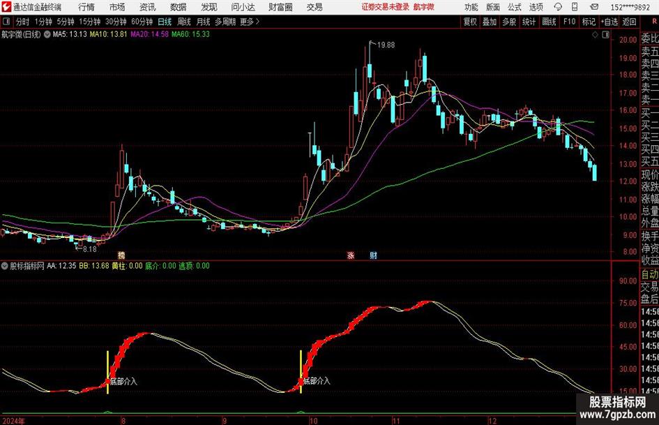 DRAWTEXT(CROSS(AA,22) AND BB<AA,AA-2,'*底部介入');