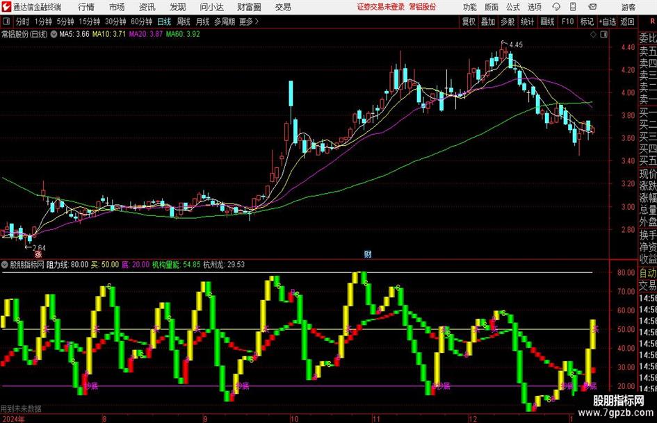 当满足条件机构量能时,在(1日前的杭州龙)和杭州龙位置之间画柱状线,宽度为1.5,0不为0则画空心柱.,COLOR0000DD