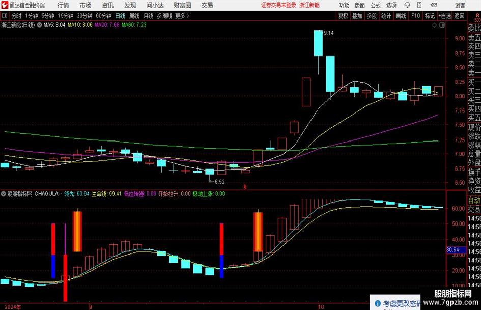 分水岭:=IF(MA(CLOSE,12)<B,B,MA(CLOSE,12));操作线:=分水岭-(EMA(C,3)-分水岭);