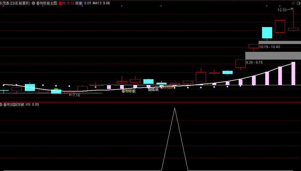 如果出现垂帘听股信号,这个时候买入再加上有浅粉色垂帘相映一定会心情不错吧! 当绿色帘低垂时,预示着明媚的阳光即将被乌云遮盖,随之而来的阴雨绵绵,反映在股票上就是阴多阳少或者连续阴跌,这可不是踏青赏绿的时候,而是止盈止损保住钱袋子,这才是英明的选择。13日线也就是白色线,它是介于13日至21日之间的交汇点,反映在图上就象一个圆弧底或平底,只要股价由锅底外运行到锅底内,即股价由均线下方运行到均线上方,K线以小阴小阳最佳,(阳多阴少更佳),无量做锅底最好。 若股价在13均线上方运行并且乖离13均线过大,此时介入要慎重。待回调到13日线处(未跌破13日线)可择机介入。 13均线形成一个相对平坦的水平底,股价也是由平底外运行至平底内,以小阴小阳的方式最佳 (阳多阴少更佳),试探买入点是股价运行到平底内。一但股价跌破均线,应考虑出局。