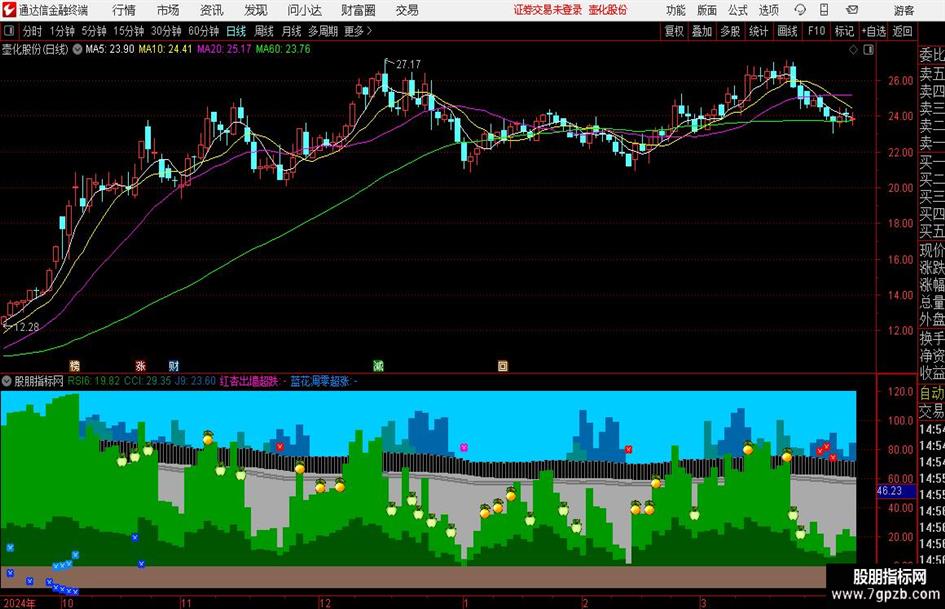 当满足条件RSI6>=0时,在RSI6和0位置之间画柱状线,宽度为4,0不为0则画空心柱.,COLOR009900