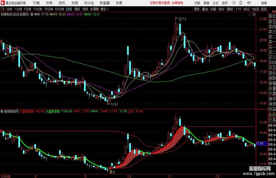 DRAWTEXT(REF(VAR5,1)=REF(VAR1,1) AND VAR5<VAR1,L*0.99,'买入'),COLORYELLOW;
