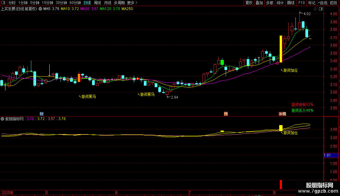 指标主要用于捕捉短线强势股(游资黑马)信号。核心逻辑是:当股价突破3日EMA的1.03倍压力位(ABC3)且单日涨幅超4%时触发买入信号,通过彩色柱状图和"游资黑马"文字标注提示。