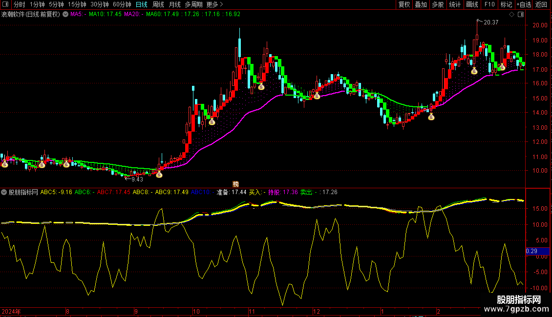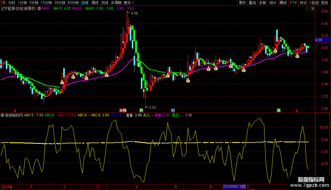 通过ABC1-ABC6计算价格动能比率,黄线(ABC5)与绿线(ABC6)的差值反映趋势强度