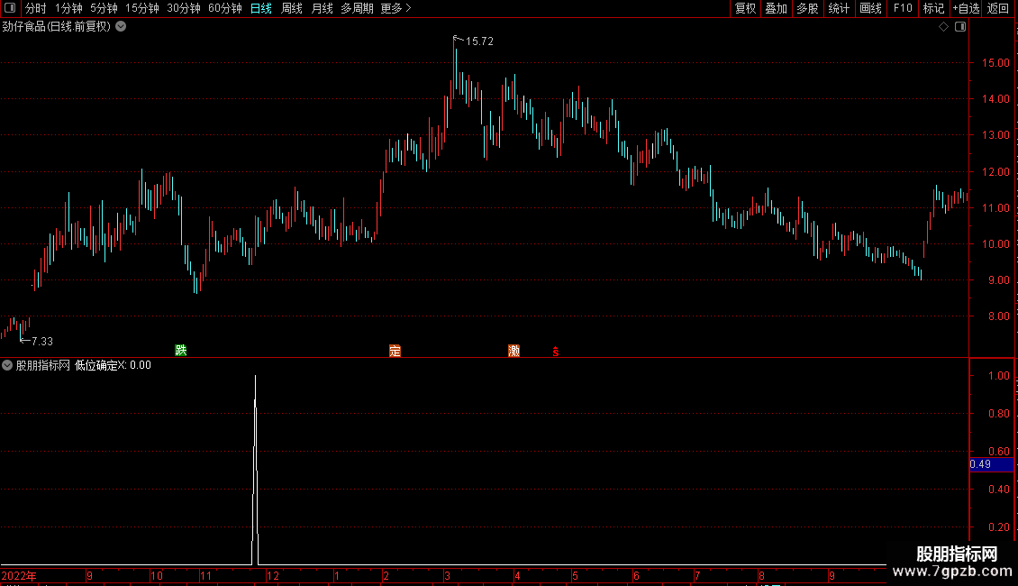 低位确定X:crOSS(XG9,XG10) AND CLOSE>MA(CLOSE,60) AND XG8;