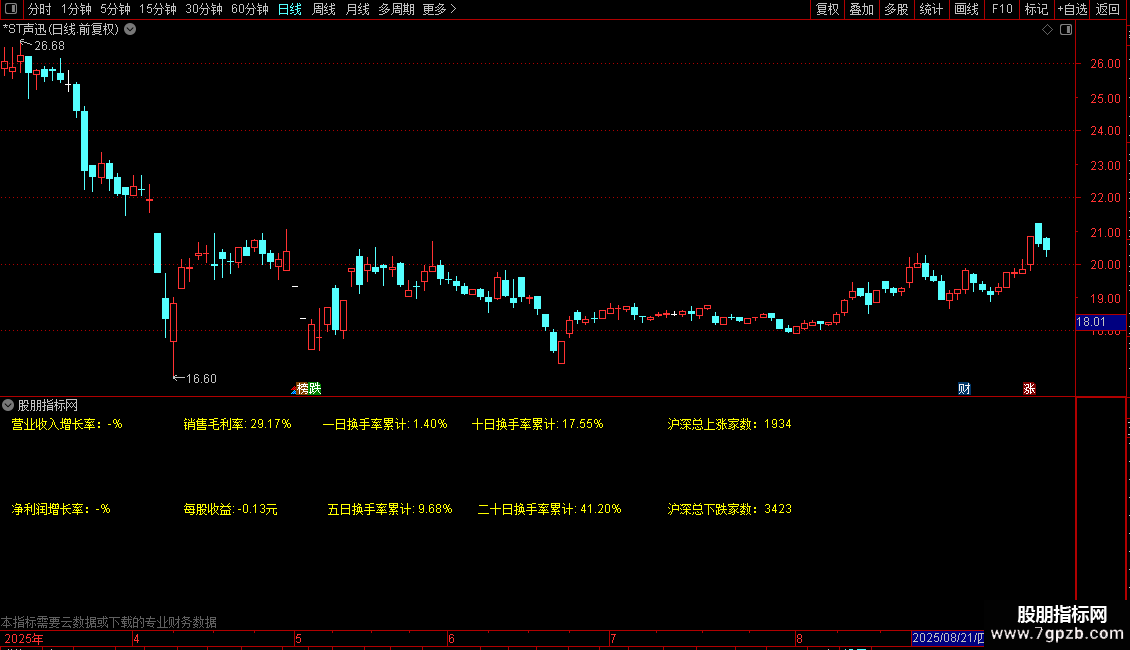 DRAWTEXT_FIX(ISLASTBAR,0.01,0,0,STRCAT(STRCAT('营业收入增长率:',CON2STR(FINVALUE(183),2)),'%')),COLORYELLOW;DRAWTEXT_FIX(ISLASTBAR,0.01,0.4,0,STRCAT(STRCAT('净利润增长率:',CON2STR(FINVALUE(184),2)),'%')),COLORYELLOW;DRAWTEXT_FIX(ISLASTBAR,0.415,0.0,1.0,STRCAT(STRCAT('一日换手率累计: ', CON2STR(SUM(DYNAINFO(37)*100,1),2)),'%')),COLORYELLOW;DRAWTEXT_FIX(ISLASTBAR,0.42,0.4,1.0,STRCAT(STRCAT('五日换手率累计: ', CON2STR(SUM(DYNAINFO(37)*100,5),2)),'%')),COLORYELLOW;DRAWTEXT_FIX(ISLASTBAR,0.56,0.0,1.0,STRCAT(STRCAT('十日换手率累计: ', CON2STR(SUM(DYNAINFO(37)*100,10),2)),'%')),COLORYELLOW;DRAWTEXT_FIX(ISLASTBAR,0.577,0.4,1.0,STRCAT(STRCAT('二十日换手率累计: ', CON2STR(SUM(DYNAINFO(37)*100,20),2)),'%')),COLORYELLOW;毛利率:=STRCAT(STRCAT('销售毛利率: ',CON2STR((FINANCE(20)-FINANCE(21))/FINANCE(20)*100,2)),'%');每股收益:=STRCAT(STRCAT('每股收益: ',CON2STR(FINANCE(38),2)),'元');DRAWTEXT_FIX(ISLASTBAR,0.17,0.0,0,毛利率),COLORYELLOW;{WWW.ZHIBIAO123.CN}DRAWTEXT_FIX(ISLASTBAR,0.17,0.4,0,每股收益),COLORYELLOW;上涨家数:=STRCAT('沪深总上涨家数:',CON2STR(DYNAINFO(60),0));下跌家数:=STRCAT('沪深总下跌家数:',CON2STR(DYNAINFO(61),0));DRAWTEXT_FIX(ISLASTBAR,0.62,0,0,上涨家数),COLORYELLOW;DRAWTEXT_FIX(ISLASTBAR,0.62,0.4,0,下跌家数),COLORYELLOW;
