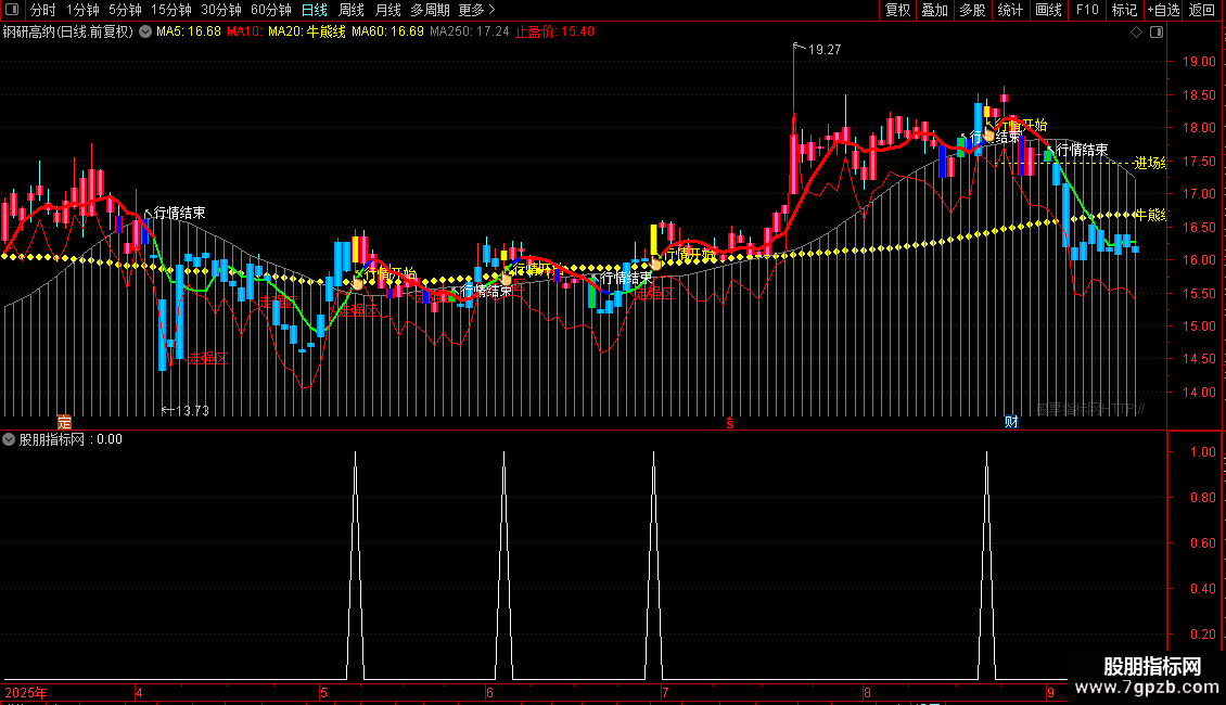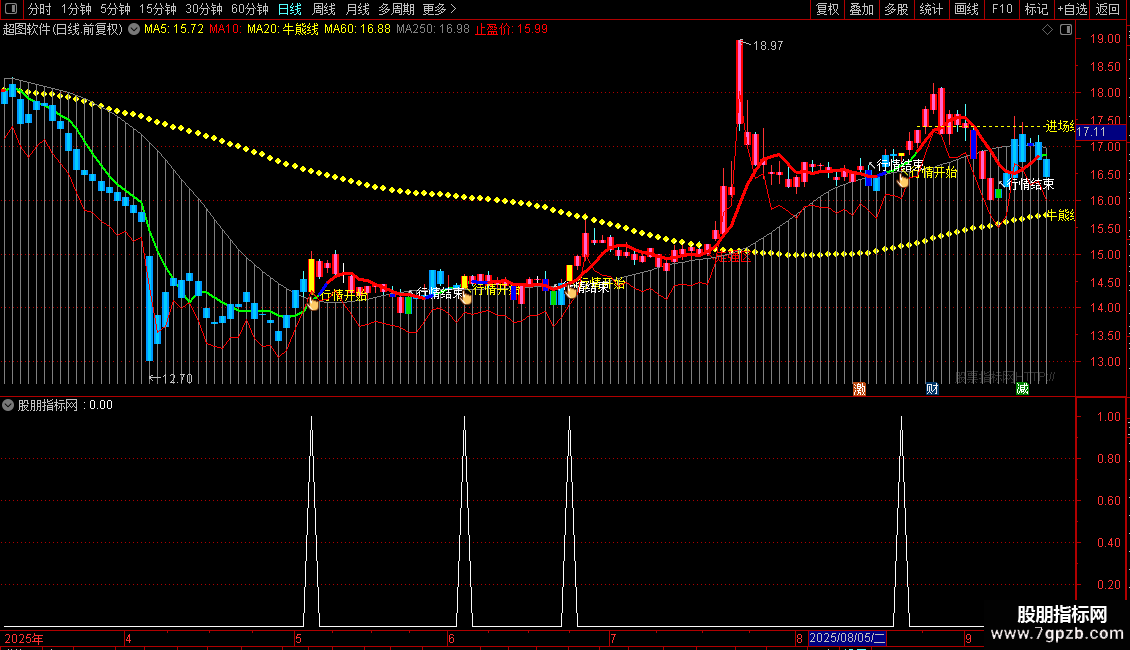 当满足条件是否最后一个周期时,在牛熊线位置书写文字,画黄色