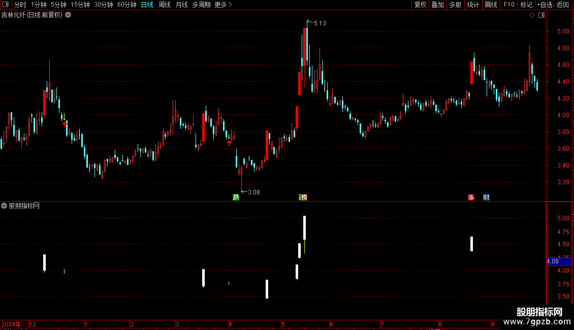 在主图指标中,红色实体代表“涨停板”,黄色“十字星”同时下方出现红色向上箭头的位置,就是信号发出的地方。
