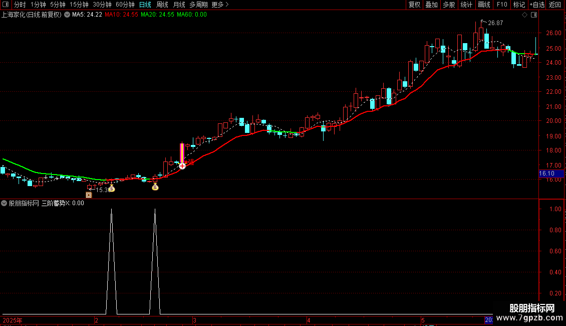 IF(蓄势< REF(蓄势,1),蓄势,DRAWNULL), COLORGREEN,LINETHICK2;