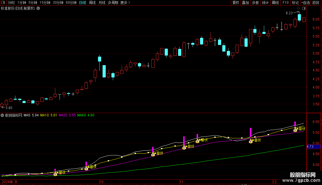 当满足条件潜伏时,在开盘价和收盘价位置之间画柱状线,宽度为1,0不为0则画空心柱.,COLORFF00FF