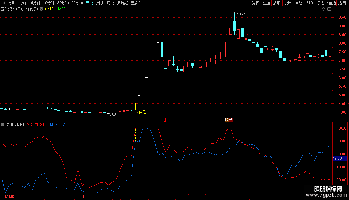 指标通过个股与大盘的相对强弱对比捕捉超买机会。个股线(蓝色)衡量股价在34日内的相对位置,大盘线(橙色)反映指数同期表现。当个股线突破90且20日内首次出现,同时满足前期涨幅温和(10日内单日涨幅<11%)、近期低位(20日内最低值<30)、持续强于大盘(20日内超10天)时,触发黄色信号柱。操作上:黄柱出现为短线买入信号,结合MACD(绿线)趋势确认更佳。