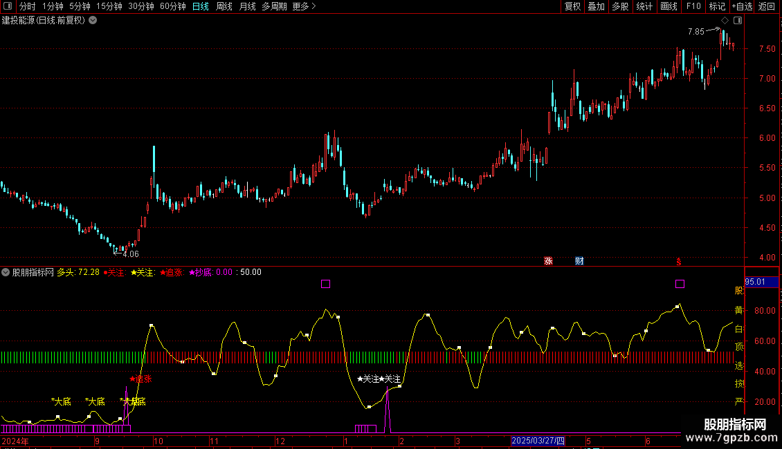 ★关注: DRAWTEXT(REF(CROSS(慢线,多头),82) AND 慢线>1.3*多头,35,'★关注'),LINETHICK1;