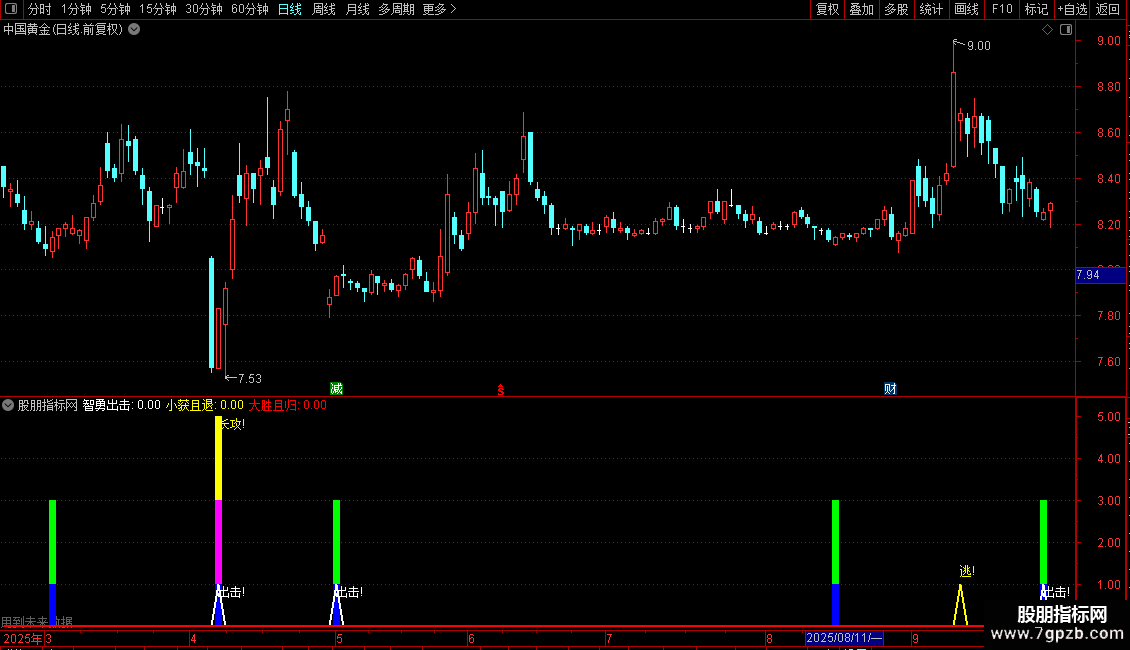 智勇出击: ZIG(3,6)>REF(ZIG(3,6),1)AND REF(ZIG(3,6),1)<REF(ZIG (3,6),2),COLORWHITE,LINETHICK2; DRAWTEXT(智勇出击=1,0.8,'出击!'),COLORWHITE;