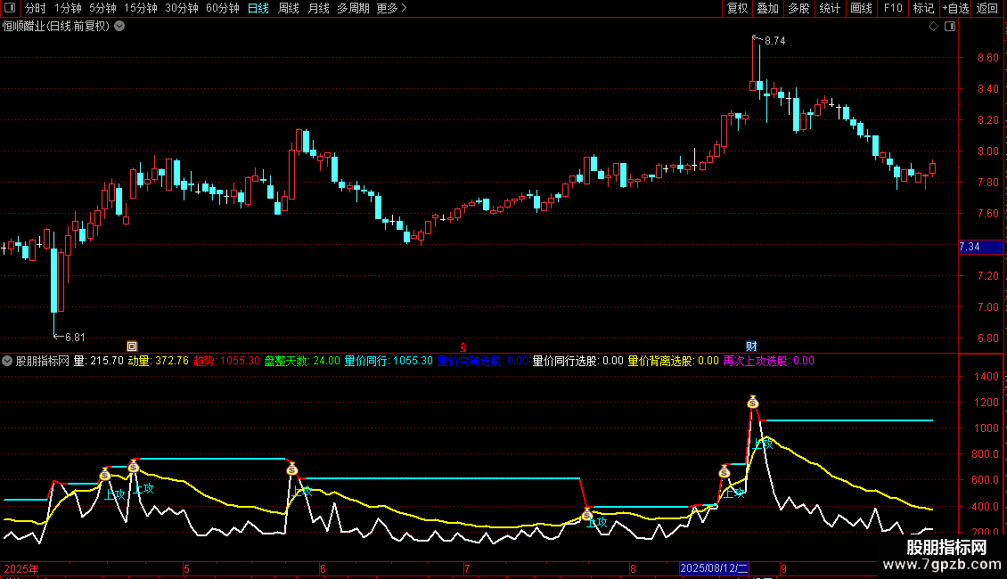 量价突破选股:IF(((((量 = 趋势) AND (CLOSE > REF(CLOSE, 1))) AND (量 > REF(量, 1))) AND (REF(A08, 2) > 0)), 888,0),LINETHICK0;