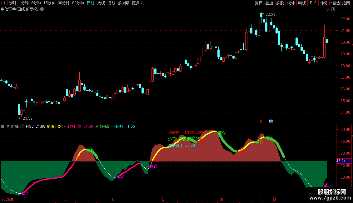 下跌趋势:=IF(HG1< 50,HG1,DRAWNULL),COLORGREEN;