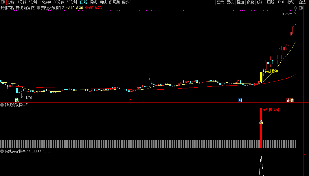 通达信【颈线突破擒牛】主副图/选股量能偏离和条件颈线突破同时满足源码