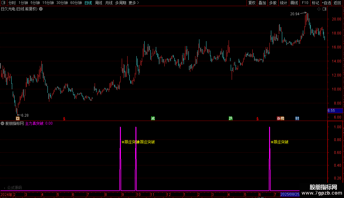 盯紧青色“跟庄突破”四字:一旦闪现,即代表股价同时踩中四大关口——放量突破主力成本、距前高仅差1.1倍且收在日内最高,叠加量能与趋势强度双重校验,确认主力真金白银进场,绝非虚涨诱多。
