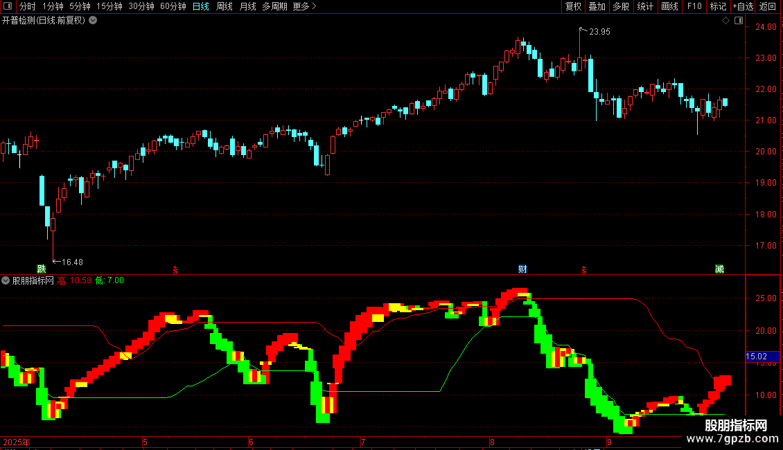 介必升:=(CLOSE-LLV(LOW,21))/(HHV(HIGH,21)-LLV(LOW,21))*1.2*CLOSE;老介1:=EMA(介必升,4);老介2:=EMA(介必升,6);老介3:=EMA(介必升,8);STICKLINE(老介1>=老介2,老介3,老介1,8,0),colorred;STICKLINE(老介1>=老介2,老介3,REF(老介1,1),5,0),colorred;STICKLINE(老介1<老介2,老介3,老介1,8,0),colorgreen;STICKLINE(老介1<老介2,老介3,REF(老介1,1),3,0),colorgreen;T1:=老介2>=老介3 AND 老介1<REF(老介1,1);T2:=老介2<老介3 AND 老介1>REF(老介1,1);STICKLINE(T1,老介1,老介3,8,0),COLOR00FFFF;STICKLINE(T1,老介1,REF(老介3,1),3,0),COLOR00FFFF;STICKLINE(T2,老介1,老介3,8,0),coloryellow;STICKLINE(T2,老介1,REF(老介3,1),3,0),colorred;高:HHV(EMA(介必升,13),21),colorred,Linethick1;低:LLV(EMA(介必升,10),21),colorgreen,Linethick1;