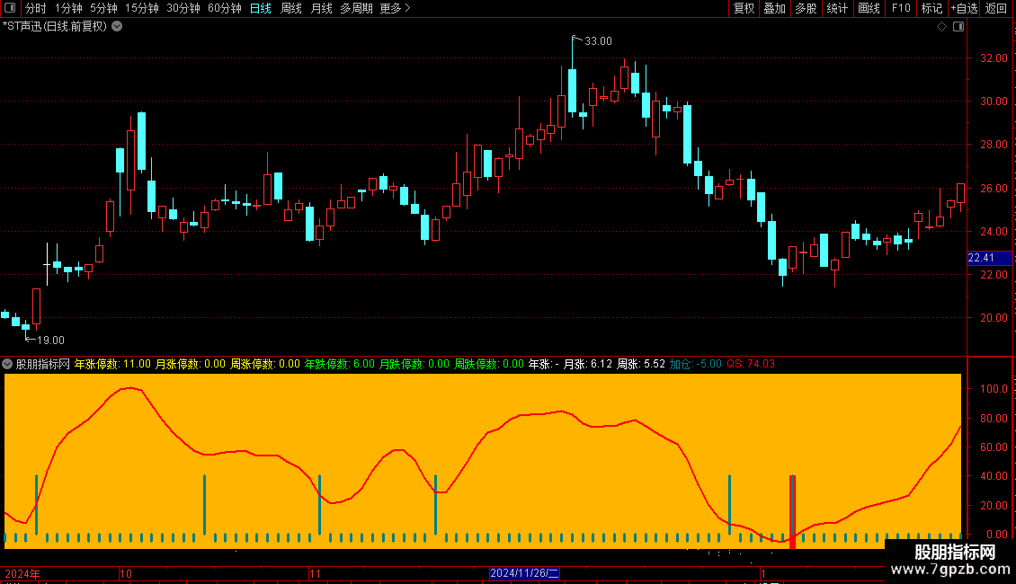 年涨: (CLOSE-REF(C,YEAR))/REF(C,YEAR)*100,POINTDOT,COLORWHITE;
