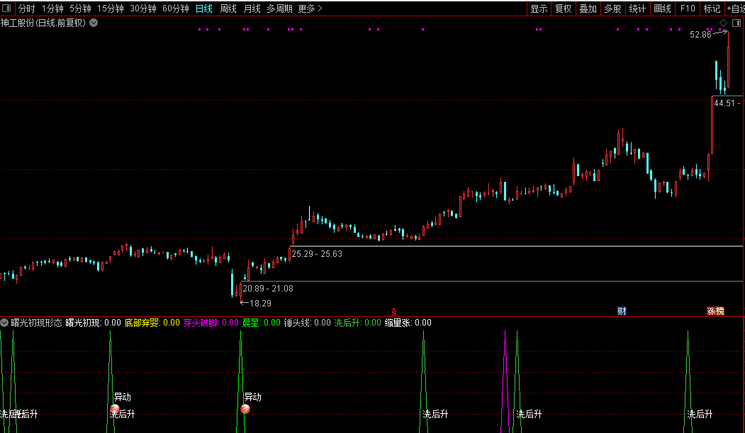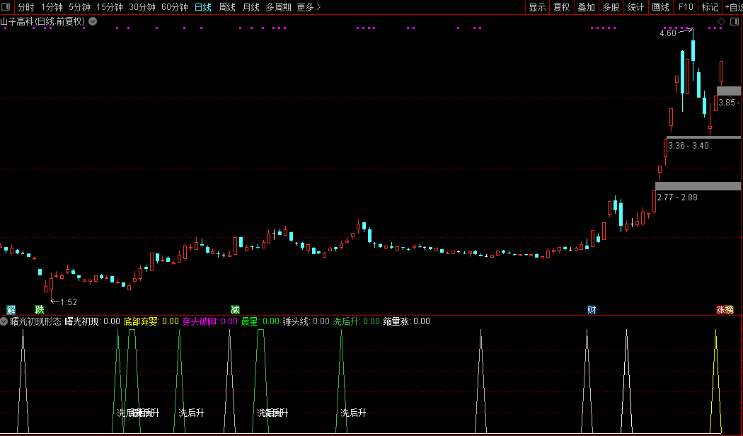 1.形态识别:自动捕捉“曙光初现”、“早晨之星”、“锤头线”等十余种经典反转K线组合,在符合条件时显示图标提示。