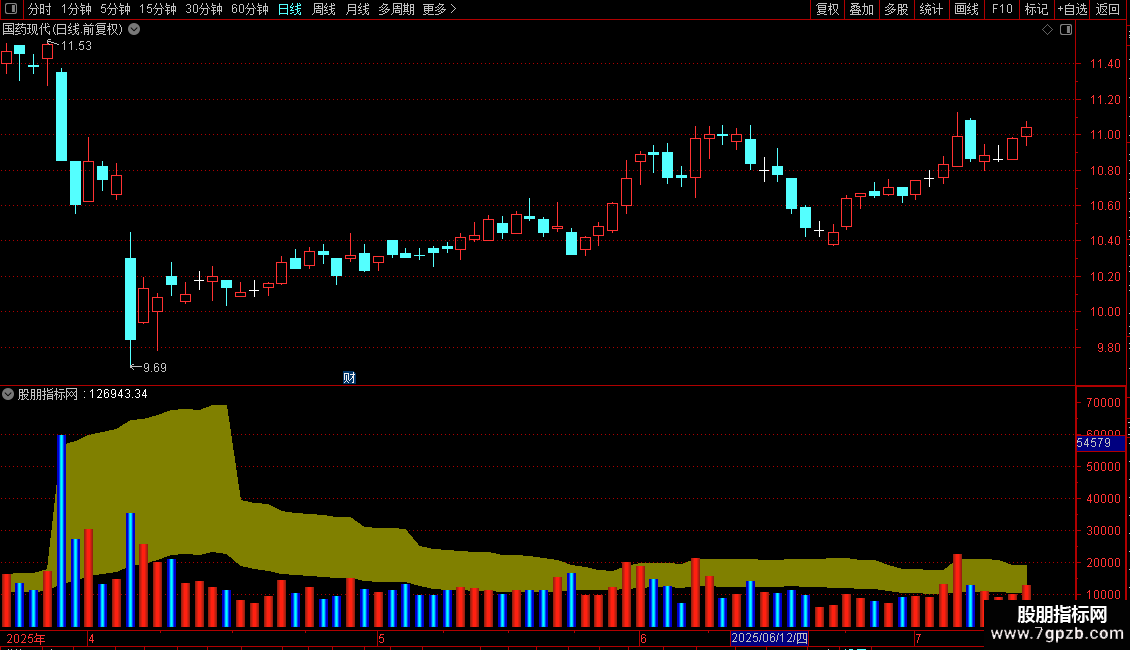 STICKLINE(CLOSE>=OPEN,0,V,1.0,0) ,COLOR1020DD;