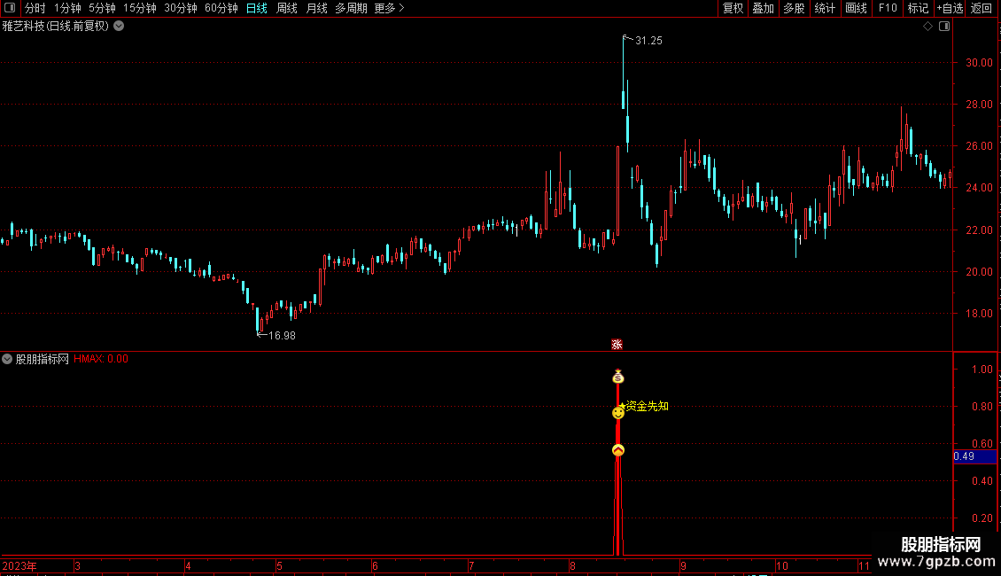 DRAWTEXT(HMAX,0.8, '★资金先知'),COLORYELLOW LINETHICK6;