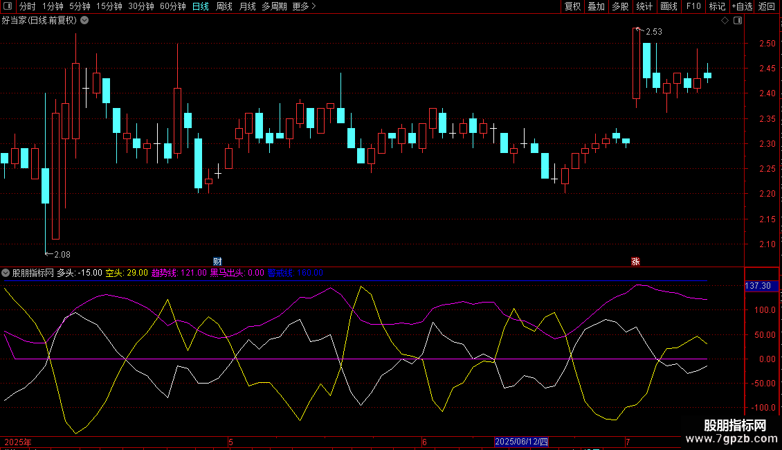 黑马出头:IF(((((CLOSE - MA(CLOSE,8)) / MA(CLOSE,8)) * 100) < (0 - 6.1)),50,0),COLORFF00FF;