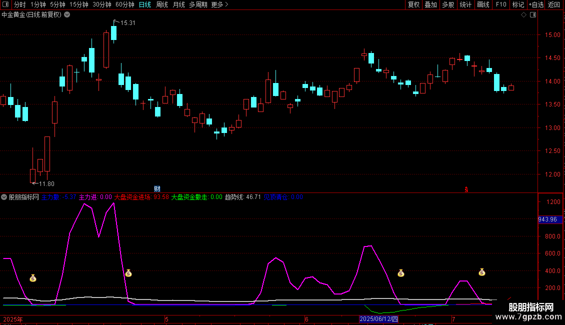 主力进: IF(V4>=0,V4,0)*100,COLORFF00FF,LINETHICK2;