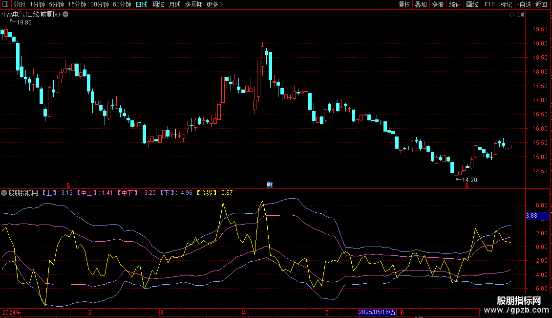 包杨通道中下:=MA(CYS7,20)-STD(CYS7,20);
