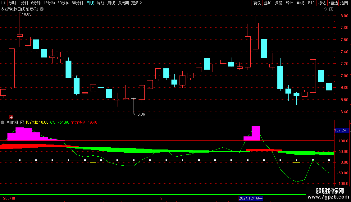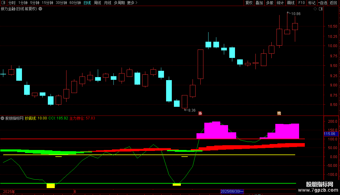 TYP赋值:如果(最高价>CANDC>开盘价)OR(最高价>OANDO>=收盘价),返回收盘价,否则返回最高价+如果(最低价输出CCI:(TYP-TYP的36.0270012日简单移动平均)/(0.015*TYP的36.0270012日平均绝对偏差)的2.0332日指数移动平均,画绿色