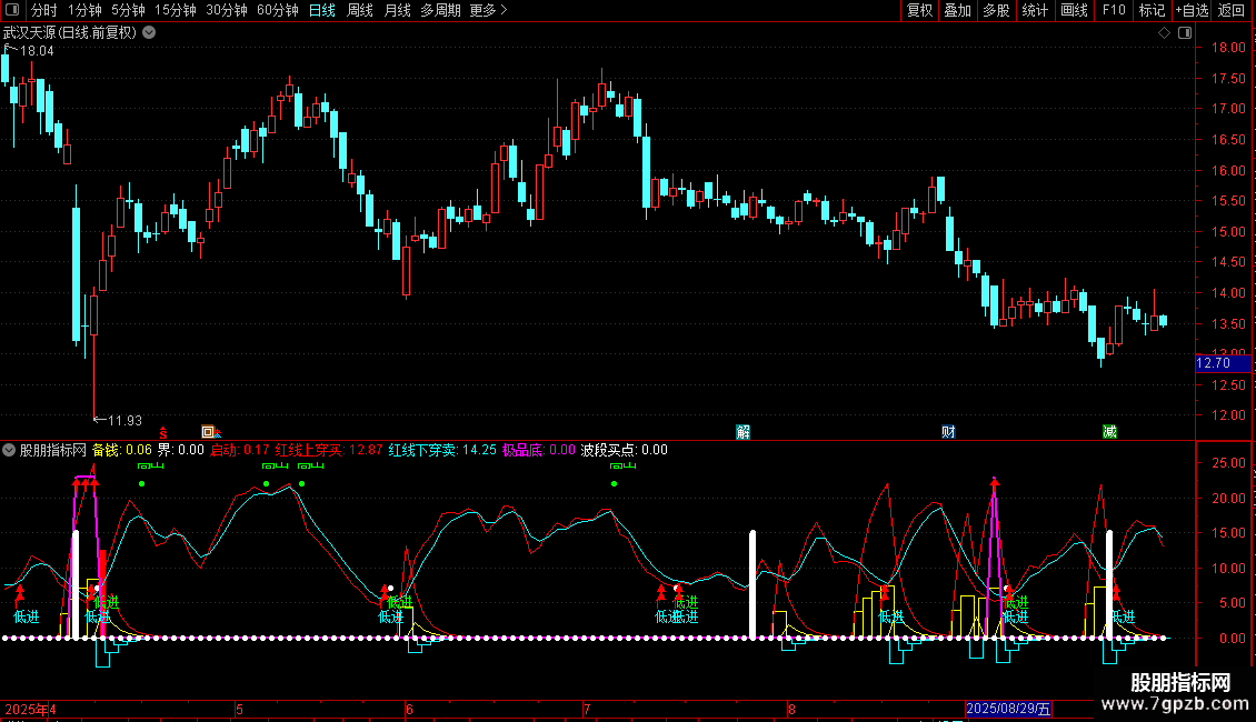 DRAWTEXT(CROSS(散户,庄家) AND 散户<30,5,'低进'),COLOR00FF00;
