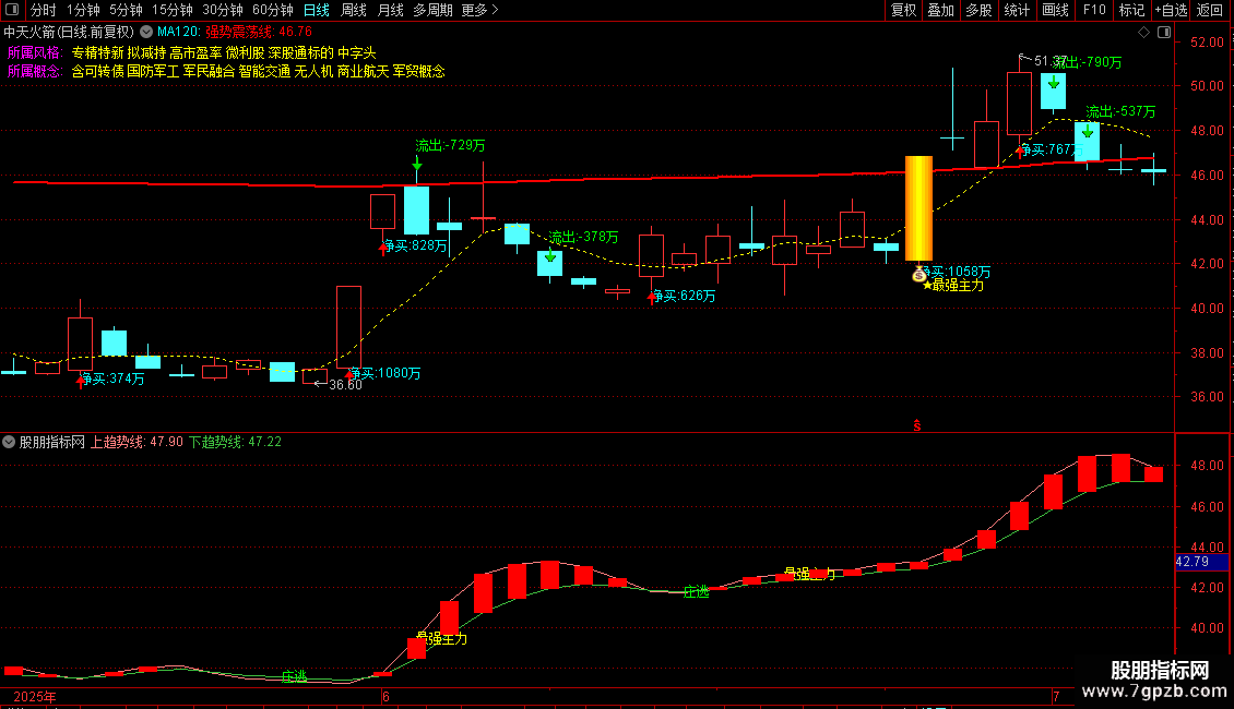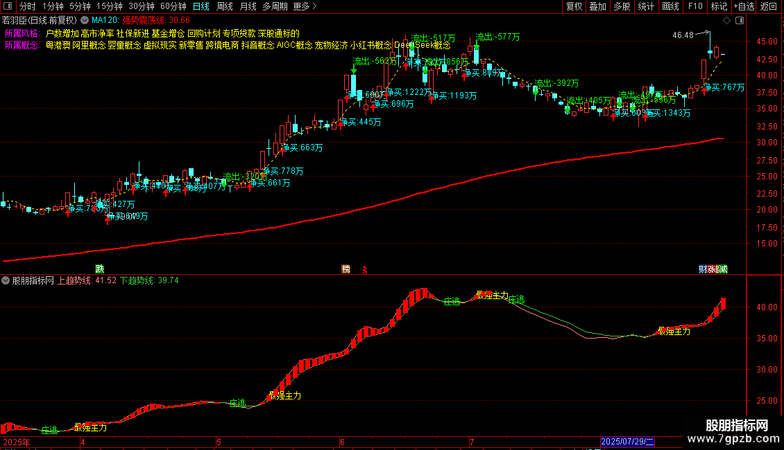DRAWTEXT(CROSS(VARG1,VARG3) AND VARG2>=REF(VARG2,1) AND MA(C,3)>MA(C,7),上趋势线,'最强主力'),COLORYELLOW;
