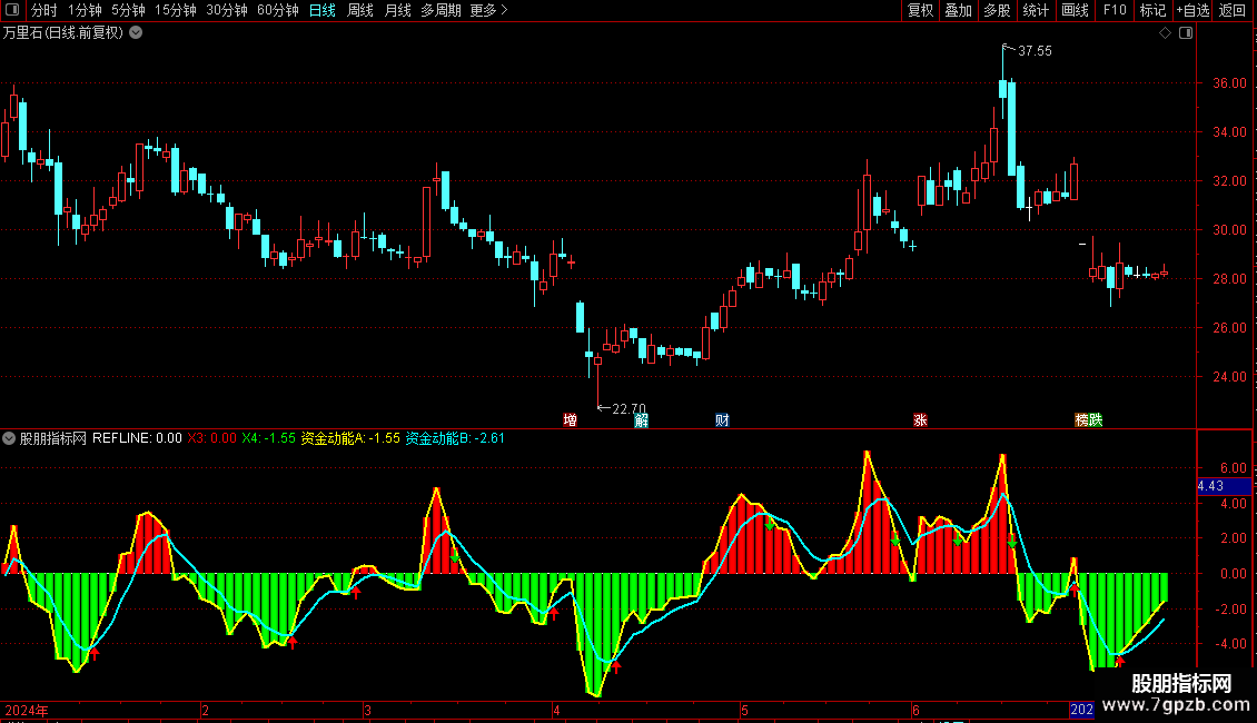 DRAWICON((CROSS(资金动能B,资金动能A) AND 资金动能A>0.25),资金动能A,2);