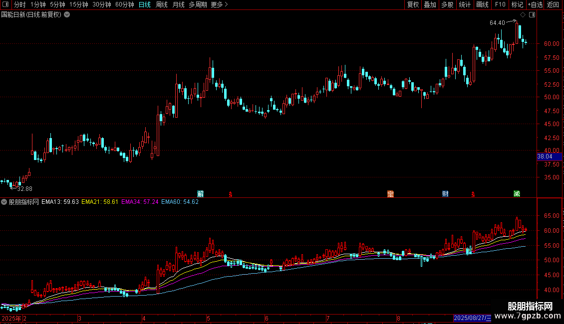 STICKLINE(X2<X3 AND C<EMA13,CLOSE,OPEN,3,0),COLORFFFF52;